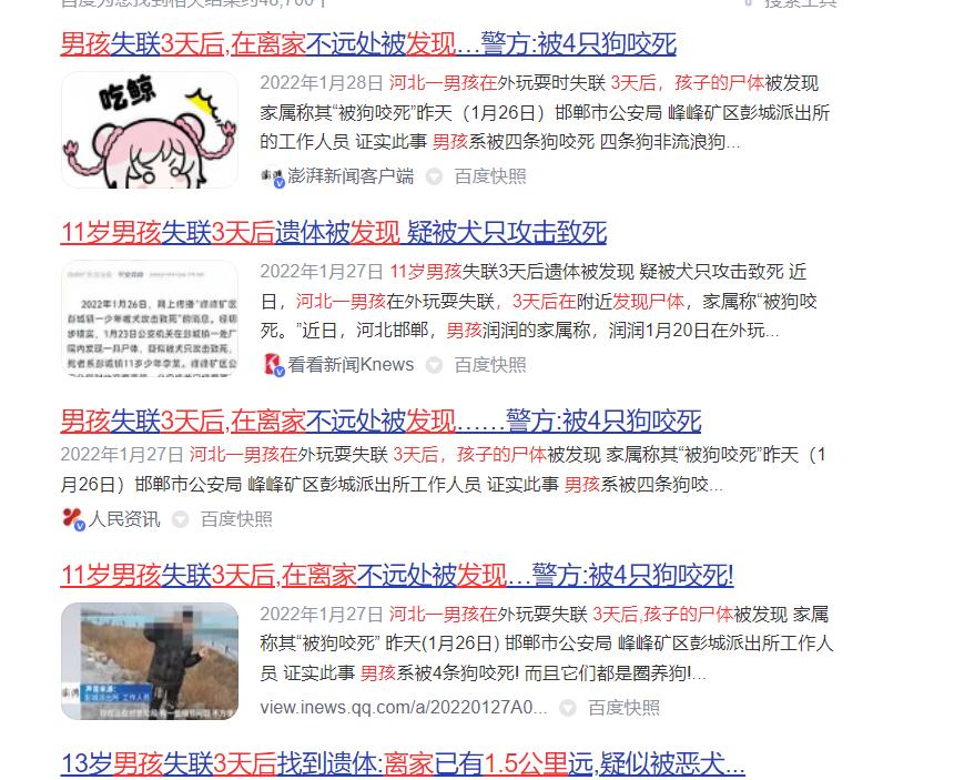 河北一个11岁的男孩突然失踪,3天后在离家1.5公里的地方发现了孩子的尸体,据当地公安发布的通报表明,该男孩是被4只恶犬咬死的,而这四条犬并非流浪犬。