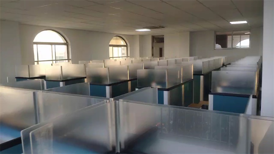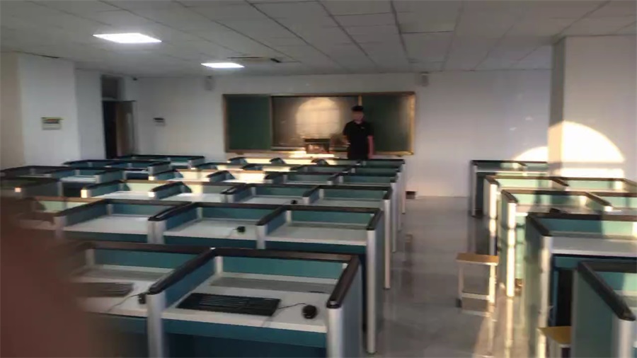 根據山東臨沂電力學校對升降屏風語音教室考場的使用需求,本次教室設計了一套智能升降屏風桌,每個座位都有可升降的屏風,考試時屏風升起后可有效的隔斷相鄰人的正常視線,防噪音效果,可達到互不干擾的作用,平時培訓學習時屏風降下;每個桌子桌面裝有液晶屏升降器,需要使用顯示屏時,隱藏在桌子內部的液晶屏升降器把顯示屏從桌子下面升到桌子上面;當不使用顯示屏時,液晶升降器自動下降,顯示屏隱藏在桌子內部,起到防盜、防塵作用,保持桌子表面的平整和美觀,和普通的教室無異,升降屏風桌實現了空間資源進行最大化的利用,平衡解決了師生之間的溝通與學生考試相互干擾的需要,滿足一教室多用的需求