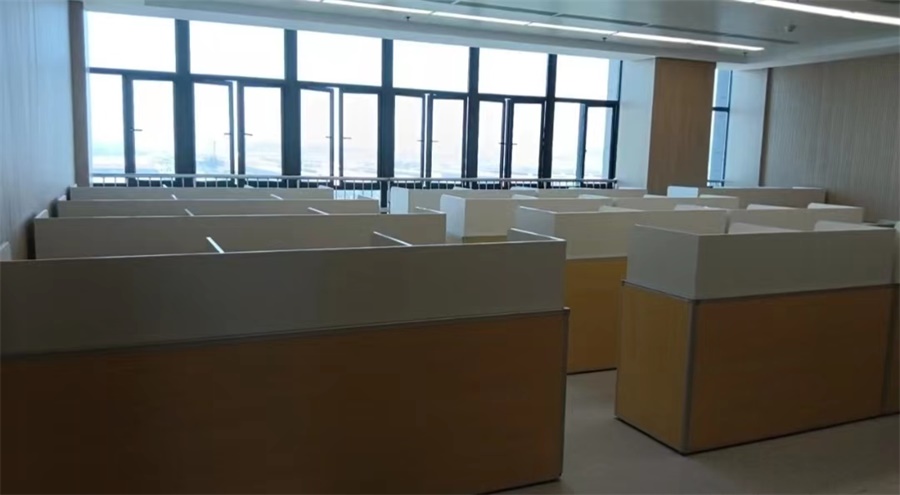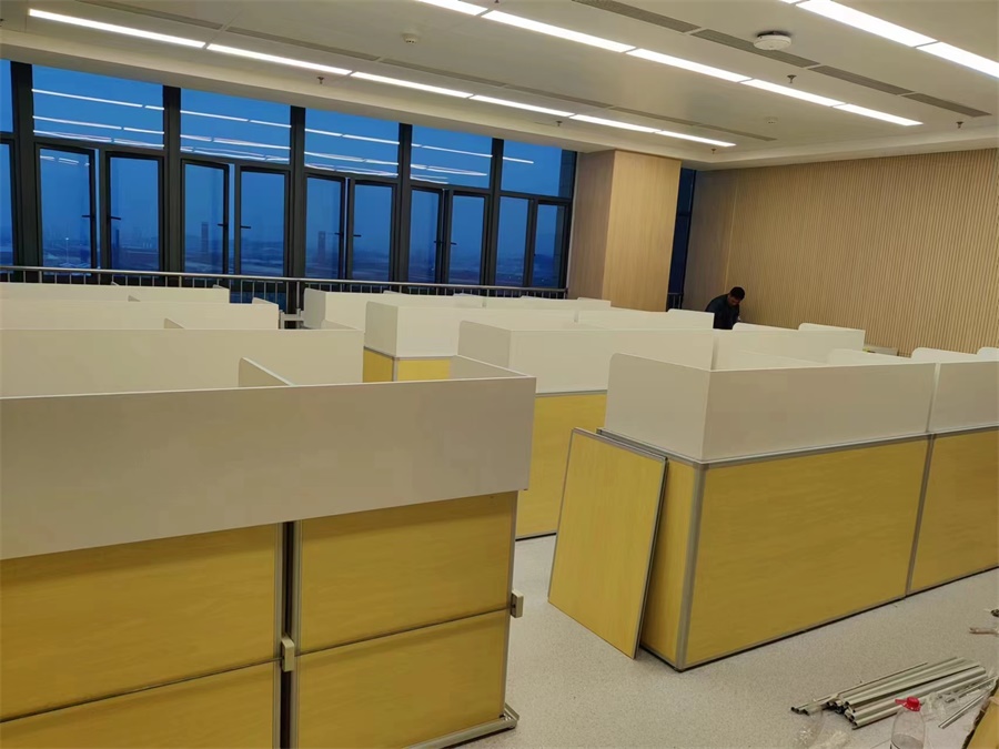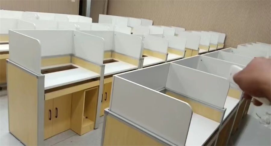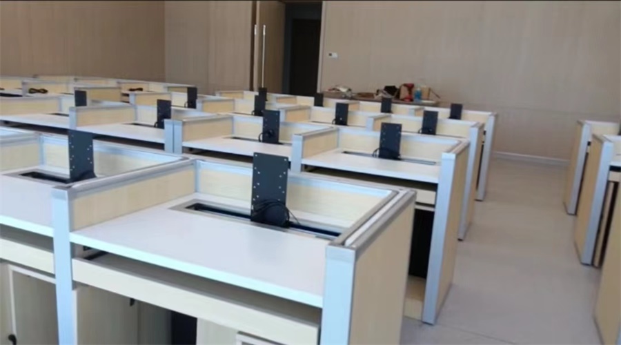 廣西柳州市婦幼保健院多媒體升降屏風桌教室考場的使用需求,本次教室設計了一套智能升降屏風桌,每個座位都有可升降的屏風,考試時屏風升起后可有效的隔斷相鄰人的正常視線,防噪音效果,可達到互不干擾的作用,平時培訓學習時屏風降下;每個桌子桌面裝有液晶屏升降器,需要使用顯示屏時,隱藏在桌子內部的液晶屏升降器把顯示屏從桌子下面升到桌子上面;當不使用顯示屏時,液晶升降器自動下降,顯示屏隱藏在桌子內部,起到防盜、防塵作用,保持桌子表面的平整和美觀,和普通的教室無異,升降屏風考試桌實現了空間資源進行最大化的利用,平衡解決了師生之間的溝通與學生考試相互干擾的需要,滿足一教室多用的需求。