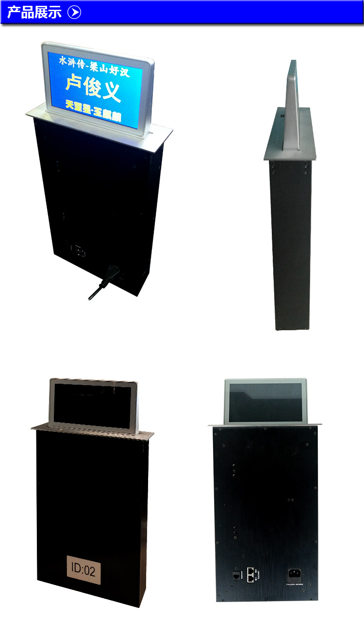 本產(chǎn)品是我司自行研發(fā),將軟件功能進行簡化,使用更加便捷,而且增加了隱藏式一體功能,客戶使用時桌牌一鍵升出至桌面,不使用時下降到桌子里面,保持桌面整潔。